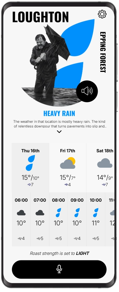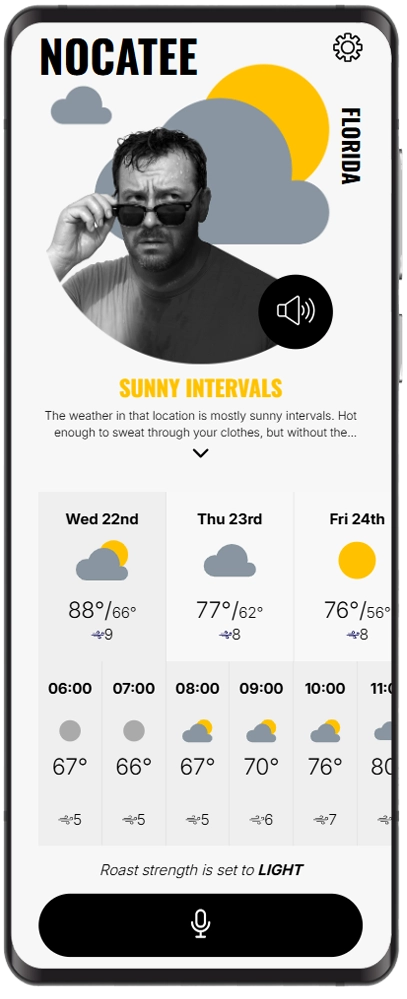 Alongside a 14-day and hourly forecast, your daily weather update is read aloud by your chosen voice and displayed on screen. You can also adjust the strength of the roast in Settings. If delicate ears are nearby, voices can be muted too.